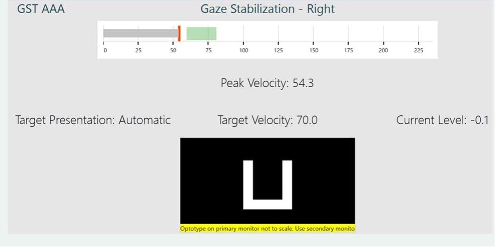 Der Test untersucht die Fähigkeit des vestibulären Systems, die Augen während Kopfbewegungen auf einen festen Punkt gerichtet zu halten. Er wird speziell zur Bewertung der Funktionalität des VOR eingesetzt, einem grundlegenden Reflex des vestibulären Systems, der es den Augen ermöglicht, auch bei Kopfbewegungen auf ein festes Ziel fokussiert zu bleiben. Der GST hilft zu bestimmen, ob das vestibuläre System ordnungsgemäß arbeitet, indem er beurteilt, wie stabil die Augen während Kopfbewegungen auf das Ziel gerichtet bleiben.