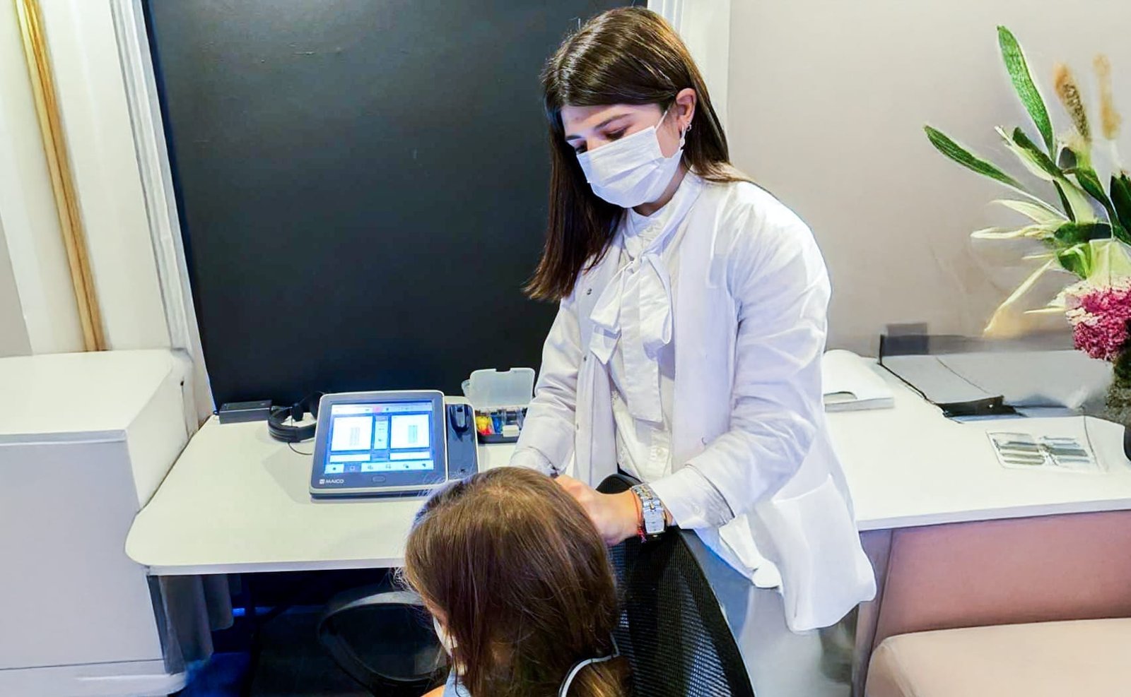 Der Hörspezialist führt eine Sonde in den Gehörgang ein, die den Luftdruck im Ohr verändert, um die Beweglichkeit des Trommelfells zu messen.