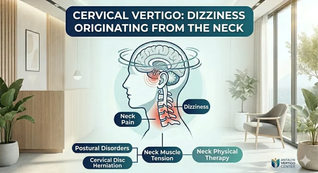 Cervical vertigo is a sensation of dizziness that originates from problems in the vertebrae, muscles, or nerves of the neck region. It is typically triggered by neck movements, and patients often describe it as “the ground slipping from under their feet” or a “sense of lightheadedness.”